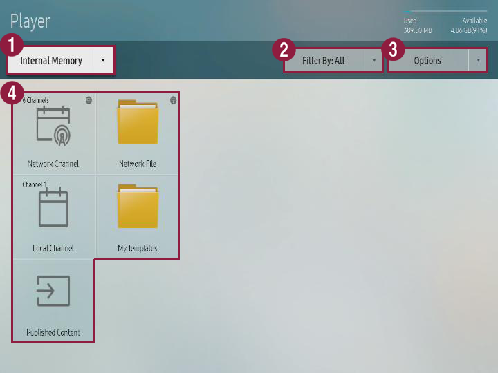 • Network channel: You can play contents, template, and schedule that are set from the server.